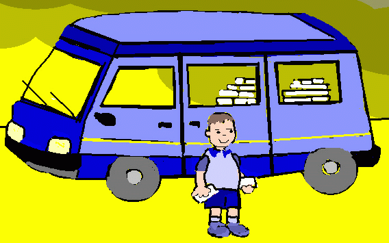 In der Garage parkt ein blauer Campingbus. Darin wird die Schokolade transportiert, die Mama im Laden kauft.