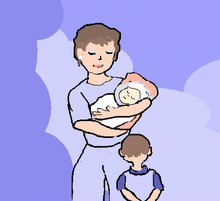 Papa sagt: "Schau mal, Niels! Mama ist wieder da. Sie hat das Baby dabei. Du hast ein Schwesterchen bekommen. Sie heißt Annika."