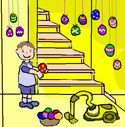 Der Flur wird mit all den bunten Ostereiern geschmückt, die Niels so sehr mag und gesammelt hat. Dort steht auch sein Staubsauger.