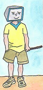 Vor Tricki und Tim öffnete sich die Klappe ihrer Box, und sie blinzelten in grelles Tageslicht. Das erste, was sie erkennen konnten, war ein Junge mit Monitorkopf, den sie bereits im Schaufenster gesehen hatten. Er hielt einen Stock in der Hand und kicherte. Sein Kichern klang mutwillig. Vor ihm mussten sie auf der Hut sein. "Wi eh eiß tdu?" fragte Tricki das außerirdische Kind. "Falo", atwortete der Junge. Gleichzeitig schlug er mit dem Stock auf Trickis Vorderseite. Eine Gleittür glitt lautlos auf. Der Vater des Jungen betrat das Kinderzimmer mit den Spiegelwänden. Sofort ließ Falo den Stock hinter seinem Rücken verschwinden.
