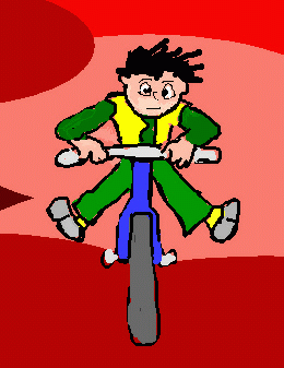 Sie setzte sich auf das Rad, aber ihre Beine waren viel zu kurz, um an die Pedalen zu kommen. Da kam ein großer Junge vorbei. Der gab ihr einen kräftigen Schubs, und sie schoss die Straße hinunter.