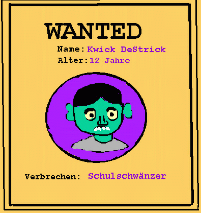 Nachdem sie bezahlt haben, lesen sie aufgeregt, was auf dem Plakat steht. Kwick ist deutlich auf dem Foto zu erkennen. Sein Name heißt Kwick DeStrick und er wird gesucht, weil er die Schule schwänzt.