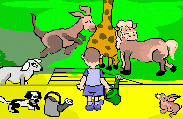 Es sind ein Hund, ein Schaf, ein Pony, ein Känguru, ein Hase und eine Giraffe.