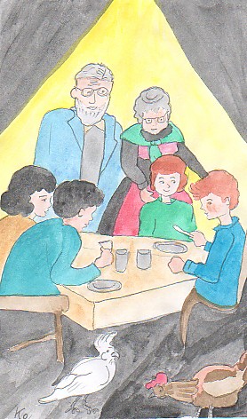 bewirtet die vier Kinder sehr großzügig. Sie freuen sich über den unerwarteten Besuch und bewundern Kiki, der sich mit ihrer braunen Henne Martha anfreundet.
